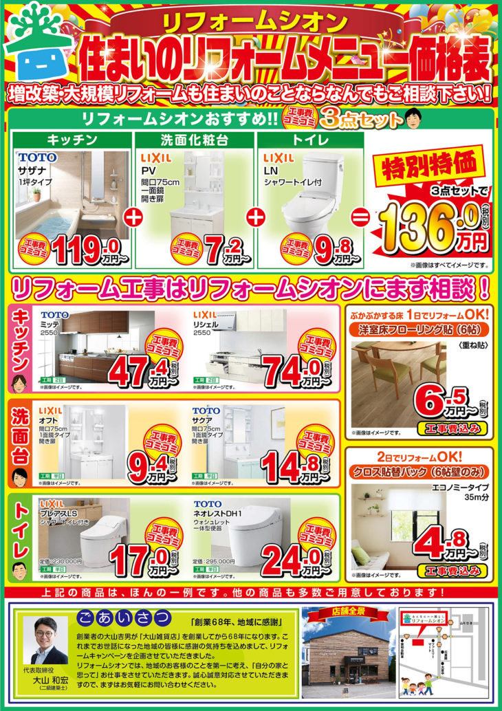 最大40%OFFの水廻り特選品のご案内や、リフォームシオンのおすすめ商品としてお得な商品を多数ご用意しています!