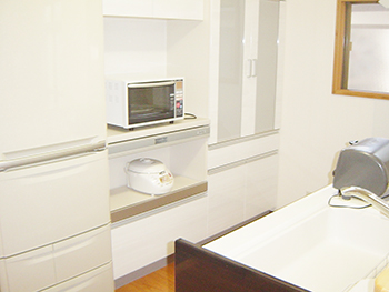 キッチンの壁際には専用の収納を設置、食器類の片づけがラクになりました。